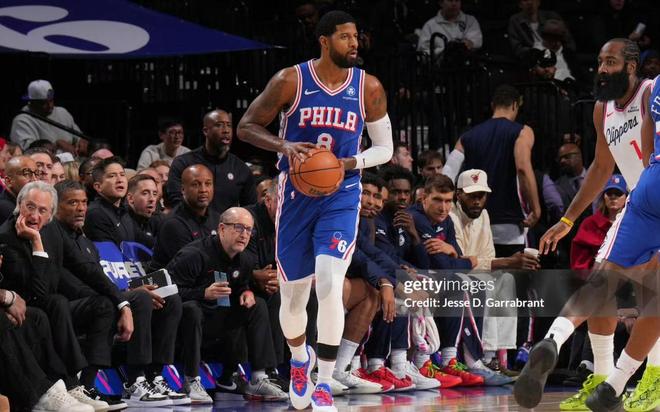 今年的费城是用年轻人的命在续命,恩比德又伤了,膝盖、脚踝、腰……这位曾经的MVP如今被戏称为“玻璃大帝”,本赛季至今只打了5场和快船的伦纳德一样场数,两个病秧子都和哈登合作过。但恩比德和哈登合作时其实挺健康,而和伦纳德一塌糊涂。现在两人回到同一起跑线,卡子和大帝未来报销似乎只是时间问题。乔治呢?今晚才迎来新赛季首秀,20多分钟的出场时间里手感冰凉,正负值首发最低,像一尊移动的金雕像。因为恩比德和乔治两人的年薪加起来超过1.1亿美元,占了球队工资帽大半了,却常常只能给球队提供“精神鼓励”。